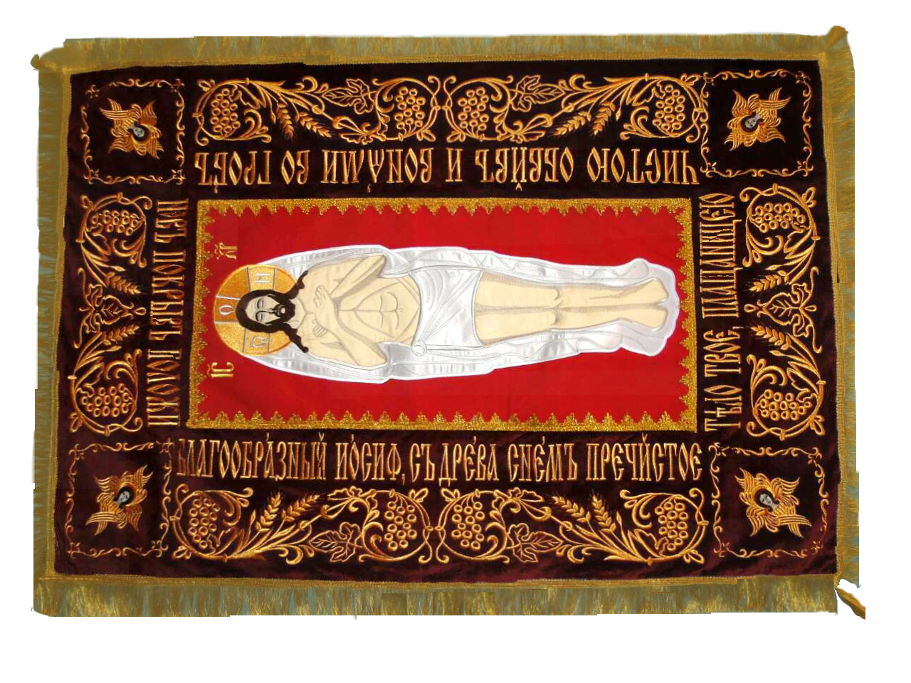 + Free ShippingВишита плащаниця Спасителя. Виготовлена з оксамиту. Прикрашена машинною вишивкою із застосуванням золотих і срібних металізований ниток. Лик Христа на плащаниці також завдано за допомогою машинної вишивки. Підкладка з атласу. Окантовка – бахрома.