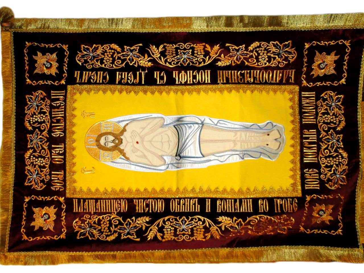 + Free ShippingВишита плащаниця Спасителя. Виготовлена з оксамиту. Прикрашена машинною вишивкою із застосуванням золотих і срібних металізований ниток. Лик Христа на плащаниці також завдано за допомогою машинної вишивки. Підкладка з атласу. Окантовка – бахрома.